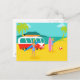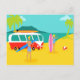 Every day can be a day at the beach with this Retro Surfer Couple Postcard. The 1960's style, minimalist art design features a fun-loving, sun worshiping, thrill seeking couple all ready to catch a wave. The setting is a tropical, island oasis with a beach of golden sand, swaying, green palm trees, a sparkling, peacock blue ocean, and an aqua sky. In the distance, we can see a teal volcanic island, which is dormant for the time being. Back on the beach, we can't help noticing the sweet ride that brought our couple to their dream destination. It's a mid century modern, red and white van with an orange and yellow surfboard strapped to the top. Though we can't be sure, it's fair to assume that the inside of the van features groovy, shag carpeting and the smell of incense! Surfer Dude and Beach Babe have matching sun-kissed tans, sun-bleached hair, and blue, tiki patterned swimsuits. Surfer Dude is holding a blue surfboard. Beach Babe is standing beside her two-toned, pink surfboard. Lying nearby, there is a red and white beach ball, waiting to fulfill its summer destiny. Catch some waves and share some love with this kitschy summer design!