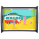 Every day can be a day at the beach with this Retro Surfer Couple Serving Tray. The 1960's style, minimalist art design features a fun-loving, sun worshiping, thrill seeking couple all ready to catch a wave. The setting is a tropical, island oasis with a beach of golden sand, swaying, green palm trees, a sparkling, peacock blue ocean, and an aqua sky. In the distance, we can see a teal volcanic island, which is dormant for the time being. Back on the beach, we can't help noticing the sweet ride that brought our couple to their dream destination. It's a mid century modern, red and white van with an orange and yellow surfboard strapped to the top. Though we can't be sure, it's fair to assume that the inside of the van features groovy, shag carpeting and the smell of incense! Surfer Dude and Beach Babe have matching sun-kissed tans, sun-bleached hair, and blue, tiki patterned swimsuits. Surfer Dude is holding a blue surfboard. Beach Babe is standing beside her two-toned, pink surfboard. Lying nearby, there is a red and white beach ball, waiting to fulfill its summer destiny. Catch some waves and share some love with this kitschy summer design!