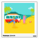 Every day can be a day at the beach with this Retro Surfer Couple Wall Decal. The 1960's style, minimalist art design features a fun-loving, sun worshiping, thrill seeking couple all ready to catch a wave. The setting is a tropical, island oasis with a beach of golden sand, swaying, green palm trees, a sparkling, peacock blue ocean, and an aqua sky. In the distance, we can see a teal volcanic island, which is dormant for the time being. Back on the beach, we can't help noticing the sweet ride that brought our couple to their dream destination. It's a mid century modern, red and white van with an orange and yellow surfboard strapped to the top. Though we can't be sure, it's fair to assume that the inside of the van features groovy, shag carpeting and the smell of incense! Surfer Dude and Beach Babe have matching sun-kissed tans, sun-bleached hair, and blue, tiki patterned swimsuits. Surfer Dude is holding a blue surfboard. Beach Babe is standing beside her two-toned, pink surfboard. Lying nearby, there is a red and white beach ball, waiting to fulfill its summer destiny. Catch some waves and share some love with this kitschy summer design!