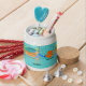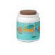 Every day can be a day at the beach with this Retro Surfer Dude Candy Jar. The 1960's style, minimalist art design features a sun-kissed, blond, surfer dude all ready to catch a wave. Our fit surfer is gazing out on the ocean through the sliding glass doors of his beachfront home. He is standing in his aqua colored living room. We can see an aqua and turquoise, stone wall and mid century modern, orange chair. On the opposite side of the glass door, we can see a patio. Beyond that, there is a golden, sandy beach, swaying palm tree, sparkling, peacock blue ocean, and an aqua sky. In the distance, we can see a teal volcanic island, which is dormant for the time being. Surfer Dude is holding a blue surfboard and wearing blue, tiki patterned board shorts. Catch some waves and share some love with this kitschy summer design!