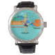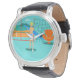 Every day can be a day at the beach with this Retro Surfer Dude Men's Watch. The 1960's style, minimalist art design features a sun-kissed, blond, surfer dude all ready to catch a wave. Our fit surfer is gazing out on the ocean through the sliding glass doors of his beachfront home. He is standing in his aqua colored living room. We can see an aqua and turquoise, stone wall and mid century modern, orange chair. On the opposite side of the glass door, we can see a patio. Beyond that, there is a golden, sandy beach, swaying palm tree, sparkling, peacock blue ocean, and an aqua sky. In the distance, we can see a teal volcanic island, which is dormant for the time being. Surfer Dude is holding a blue surfboard and wearing blue, tiki patterned board shorts. Catch some waves and share some love with this kitschy summer design!