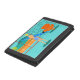 Every day can be a day at the beach with this Retro Surfer Dude Nylon Wallet. The 1960's style, minimalist art design features a sun-kissed, blond, surfer dude all ready to catch a wave. Our fit surfer is gazing out on the ocean through the sliding glass doors of his beachfront home. He is standing in his aqua colored living room. We can see an aqua and turquoise, stone wall and mid century modern, orange chair. On the opposite side of the glass door, we can see a patio. Beyond that, there is a golden, sandy beach, swaying palm tree, sparkling, peacock blue ocean, and an aqua sky. In the distance, we can see a teal volcanic island, which is dormant for the time being. Surfer Dude is holding a blue surfboard and wearing blue, tiki patterned board shorts. Catch some waves and share some love with this kitschy summer design!