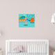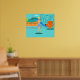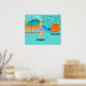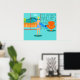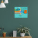 Every day can be a day at the beach with this Retro Surfer Dude Poster. The 1960's style, minimalist art design features a sun-kissed, blond, surfer dude all ready to catch a wave. Our fit surfer is gazing out on the ocean through the sliding glass doors of his beachfront home. He is standing in his aqua colored living room. We can see an aqua and turquoise, stone wall and mid century modern, orange chair. On the opposite side of the glass door, we can see a patio. Beyond that, there is a golden, sandy beach, swaying palm tree, sparkling, peacock blue ocean, and an aqua sky. In the distance, we can see a teal volcanic island, which is dormant for the time being. Surfer Dude is holding a blue surfboard and wearing blue, tiki patterned board shorts. Catch some waves and share some love with this kitschy summer design!