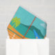 Every day can be a day at the beach with this Retro Surfer Dude Tissue Paper. The 1960's style, minimalist art design features a sun-kissed, blond, surfer dude all ready to catch a wave. Our fit surfer is gazing out on the ocean through the sliding glass doors of his beachfront home. He is standing in his aqua colored living room. We can see an aqua and turquoise, stone wall and mid century modern, orange chair. On the opposite side of the glass door, we can see a patio. Beyond that, there is a golden, sandy beach, swaying palm tree, sparkling, peacock blue ocean, and an aqua sky. In the distance, we can see a teal volcanic island, which is dormant for the time being. Surfer Dude is holding a blue surfboard and wearing blue, tiki patterned board shorts. Catch some waves and share some love with this kitschy summer design!