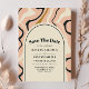 The "Retro Swirl Arch Save The Date Card" masterfully combines pink, black, gold, and cream hues, creating a visually striking announcement for your special day. The retro swirls give it a whimsical, timeless charm, while the gold accents add a touch of elegance and celebration. Enclosed within an arch design, the card warmly invites guests to reserve the date for your upcoming wedding, offering a sneak peek at the sophisticated and stylish event to come.