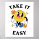 A retro Pacman inspired emoji with flowers and sparkles, and the saying "Take It Easy."