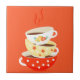 A retro cute, vintage image illustration of three retro style old fashioned tea cups stacked on top of one another against a bright orange on trend background. This whimsical design is for tea and coffee lovers everywhere.