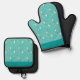 An oven mitt set with a retro star pattern in teal and white on a light teal background and a dark teal border.