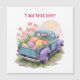 This heartwarming watercolor design features a retro two-tone pickup truck in teal blue and soft purple, driving away into a sunny spring day. The truck bed is overflowing with giant, colorful Easter eggs and blooming pink flowers, capturing the pure joy of the holiday.