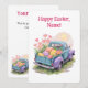 This heartwarming watercolor design features a retro two-tone pickup truck in teal blue and soft purple, driving away into a sunny spring day. The truck bed is overflowing with giant, colorful Easter eggs and blooming pink flowers, capturing the pure joy of the holiday.