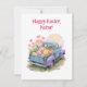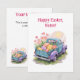 This heartwarming watercolor design features a retro two-tone pickup truck in teal blue and soft purple, driving away into a sunny spring day. The truck bed is overflowing with giant, colorful Easter eggs and blooming pink flowers, capturing the pure joy of the holiday.