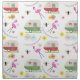 This product features a pattern which incorporates illustrations of retro vintage inspired camper trailers, pink flamingos, bees, and flowers.