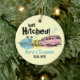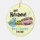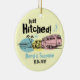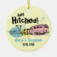 Fun vintage design ornament featuring a retro trailer hitched to a car driving to their beach honeymoon. Stamp style text says JUST HITCHED. Perfect wedding shower or engagement gift for the newlyweds. Personalize it with whatever you like. Coordinated T-shirts, tote bags, save the date announcements and magnets, thank you notes, postage stamps and more! PinkInkArt original!