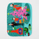 This Retro Family Trimming the Christmas Tree Baby Burp Cloth contains every holiday tradition but the fruitcake. A 1960's cartoon family is at home in their mid century modern living room. There is a turquoise and teal brick wall and a red, cone fireplace with a roaring fire. Dad is wearing a black suit and red tie. He is hanging green Christmas stockings on the mod chimney with care. Next to dad, Junior is perched precariously on an orange chair. Whoa! Easy there, Junior! He is reaching out to put an ornament on a kitchy, pink, Christmas tree that is already decked out with teal ornaments and a yellow star. On the opposite side of the tree, Mom is holding a festively wrapped present. Hey, no shaking allowed! Mom is wearing a bright red wiggle dress with white trim. She is also wearing a Santa hat. Beneath the tree, there is a sleek black cat wearing a red bow. On the floor, there is a green and black record player surrounded by colorful vinyl albums. You just know that the family is singing along with their favorite Christmas carols while they are decking the halls. The opposite side of the burp cloth features a turquoise and teal brick pattern.