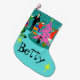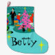 This customizable Retro Family Trimming the Christmas Tree Holiday Stocking contains every holiday tradition but the fruitcake. A 1960's cartoon family is at home in their mid century modern living room. There is a turquoise and teal brick wall and a red, cone fireplace with a roaring fire. Dad is wearing a black suit and red tie. He is hanging green Christmas stockings on the mod chimney with care. Next to dad, Junior is perched precariously on an orange chair. Whoa! Easy there, Junior! He is reaching out to put an ornament on a kitchy, pink, Christmas tree that is already decked out with teal ornaments and a yellow star. On the opposite side of the tree, Mom is holding a festively wrapped present. Hey, no shaking allowed! Mom is wearing a bright red wiggle dress with white trim. She is also wearing a Santa hat. Beneath the tree, there is a sleek black cat wearing a red bow. On the floor, there is a green and black record player surrounded by colorful vinyl albums. You just know that the family is singing along with their favorite Christmas carols while they are decking the halls. Below the design, two, yellow starbursts surround the name of the stocking owner. The opposite side of the stocking features a turquoise and teal brick pattern.