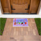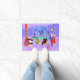 This Retro Tropical Christmas Party Door Mat is festive enough to brighten anyone's holiday outlook! The cartoon design features the type of wildly sophisticated holiday party that is normally only seen in Christmas movies from the 1960s. There is a mid century modern living room filled with partygoers enjoying the swanky, purple decor. A lovely woman in a French maid's uniform is carrying a tray of martinis. She is standing beside a red, cone fireplace with a roaring fire. Three green stockings are hung by the mod chimney with care. In the center of the room, an attractive couple is lounging in orange egg chairs. The woman is wearing a festive, green dress. The man is wearing a black suit with a red tie. They are each holding a martini. Another couple is getting cozy beneath a dangling, yellow, Sputnik chandelier. The distinguished, grey haired gentleman is wearing a blue suit, light blue shirt and red tie. He is also wearing a Santa hat and holding a martini in each hand, showing the world that his partying days are far from over. His companion is a shapely blonde in a stunning red dress. Mr. Distinguished had better look out because she is holding a sprig of mistletoe in her hand. At the front of the room, there is a kitschy, pink Christmas tree, complete with teal ornaments and a yellow star. Behind this scene, we can see through floor to ceiling glass walls. The outdoor scene features a round, turquoise swimming pool. We can see the purple silhouette of a woman dipping her legs into the water. Between purple, stone walls, there are silhouettes of palm trees decorated with ornaments and Christmas lights. The silhouettes of dancing and talking partygoers are also visible. If there's one thing this proves, it's that, while people who live in glass houses shouldn't throw stones, they should definitely throw parties!