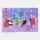 This Retro Tropical Christmas Party Kitchen Towel is festive enough to brighten anyone's holiday outlook! The cartoon design features the type of wildly sophisticated holiday party that is normally only seen in Christmas movies from the 1960s. There is a mid century modern living room filled with partygoers enjoying the swanky, purple decor. A lovely woman in a French maid's uniform is carrying a tray of martinis. She is standing beside a red, cone fireplace with a roaring fire. Three green stockings are hung by the mod chimney with care. In the center of the room, an attractive couple is lounging in orange egg chairs. The woman is wearing a festive, green dress. The man is wearing a black suit with a red tie. They are each holding a martini. Another couple is getting cozy beneath a dangling, yellow, Sputnik chandelier. The distinguished, grey haired gentleman is wearing a blue suit, light blue shirt and red tie. He is also wearing a Santa hat and holding a martini in each hand, showing the world that his partying days are far from over. His companion is a shapely blonde in a stunning red dress. Mr. Distinguished had better look out because she is holding a sprig of mistletoe in her hand. At the front of the room, there is a kitschy, pink Christmas tree, complete with teal ornaments and a yellow star. Behind this scene, we can see through floor to ceiling glass walls. The outdoor scene features a round, turquoise swimming pool. We can see the purple silhouette of a woman dipping her legs into the water. Between purple, stone walls, there are silhouettes of palm trees decorated with ornaments and Christmas lights. The silhouettes of dancing and talking partygoers are also visible. If there's one thing this proves, it's that, while people who live in glass houses shouldn't throw stones, they should definitely throw parties!