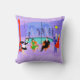 This Retro Tropical Cocktail Party Throw Pillow is intoxicating in its detail. The cartoon design features the type of wildly sophisticated cocktail party that is normally only seen in movies from the 1960s. There is a mid century modern living room filled with partygoers enjoying the swanky, purple decor. A lovely woman in a French maid's uniform is carrying a tray of martinis. She is standing beside a red, cone fireplace with a roaring fire. In the center of the room, an attractive couple is lounging in orange egg chairs. The woman is wearing a bright, green dress. The man is wearing a black suit with a red tie. They are each holding a martini. Another couple is getting cozy beneath a dangling, yellow, Sputnik chandelier. The distinguished, white haired gentleman is wearing a blue suit, light blue shirt and red tie. He is also holding a martini in each hand, showing the world that his partying days are far from over. His companion is a shapely blonde in a stunning red dress. Behind this scene, we can see through floor to ceiling glass walls. The outdoor scene features a round, turquoise swimming pool. We can see the purple silhouette of a woman dipping her legs into the water. Between purple, stone walls, there are silhouettes of palm trees. The silhouettes of dancing and talking partygoers are also visible. The opposite side of the pillow features a fun, purple, stone pattern. If there's one thing this proves, it's that, while people who live in glass houses shouldn't throw stones, they should definitely throw parties!