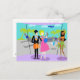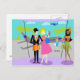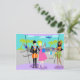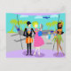 This Retro Tropical Vacation Postcard features a minimalist cartoon drawing of an attractive couple taking the trip of a lifetime! The mid century modern scene is set in a tropical airport. Mr. and Mrs. Tourist are posing in front of the floor to ceiling glass walls. After all, they want to document every moment of their vacation to paradise. Mr. Tourist is dressed in a black suit, light blue shirt, red tie, and black fedora. He is holding an orange suitcase. His arm is around his beautiful bride. She is wearing a hot pink dress. A bright blue handbag is slung over one arm. Not a hair is out of place of her pretty blonde head. It wouldn't do to travel by air and not look your best! Both of them are wearing colorful flower leis around their necks. Beside them, we see a stunning, golden skinned hula girl with flowing black hair. Miss Hula is wearing a traditional grass skirt and an orange bikini top. If that top could talk, it would say, "Hey! I'm a talking top and I match the orange flower in her hair!" On one arm, she has an extra Hawaiian lei ready to offer the next person to step off the plane. Ah, can't you smell the orchids now? On the opposite side of the glass, we can see the luxury, jumbo jetliner that brought the couple to their vacation destination. On the tarmac, 1960's style flight attendant is making her way to the building. She is wearing a form fitting, blue uniform and a blue pillbox hat. Yowza! That gorgeous blonde can offer me coffee, tea, or milk anytime! The sky a shade of aqua that makes you want to reach for the suntan oil! We can see the green silhouettes of palm trees and the dark blue silhouette of a plane flying among the fluffy, light blue clouds. Oh, I hope those poor suckers on that plane aren't on their way back to the daily grind! Aloha!
