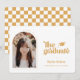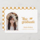 Retro Type Graduation Photo Announcement. Features, single arch frame photo, grad cap accent, retro typography in rustic vintage yellow and coordinating checker pattern backing.