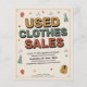A vintage-inspired advertising flyer for a used clothes sales featuring bold retro typography, colorful graphic elements and illustrated clothing items like floral dress, shirts, and jacket in warm tones.