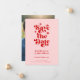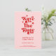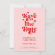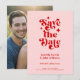 Retro Typography Wedding Save The Date Invitation. With a modern retro typography "save the date" in a pink and red color combo on the front with names and date, website or your own text in a simple and minimal design. A full-frame photo on the back of the wedding announcement. A unique and affordable Wedding Save the Date for couples on a budget. Choose prints and/or a digital announcement download.