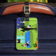 This customizable Retro Urban Cartoon Couple Luggage Tag features the cartoon drawing of an elegantly decorated penthouse apartment, overlooking a city skyline. The apartment features a green floor and a green brick wall. On the wall are four Classic Movie Martini Stretched Canvas Prints, also available from StrangeLittleOnion's Zazzle store (hint, hint!). Three of the prints feature turquoise backgrounds and one is on a black background. Beneath the canvas prints, is a blue, mid century modern sofa. A sophisticated, raven-haired beauty is sitting on the sofa. She is wearing a classic, little, black dress with a hot pink bodice. On the opposite side of the room there is a suave, tall, dark, and handsome man. He is wearing a black suit, white shirt, and green tie. In one hand, he is holding a vinyl record album, and, in the other hand, he is holding a fun album cover. On the floor, there is an orange ottoman holding a green and black record player. Propped against the ottoman is another album cover with a record rolling out of the side. There are also three colorful vinyl albums scattered about the floor. Behind the man, we can see through the sliding glass doors onto a green balcony. A white cat wearing a pink collar is perched on the edge of the balcony. Beyond the cat, there is a breathtaking city skyline complete with skyscrapers and a yellow crescent moon. The opposite side features a green background and plenty of room for customizing with your contact information. If this is how the other half lives, sign me up!