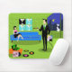 This Retro Urban Cartoon Couple Mousepad features the cartoon drawing of an elegantly decorated penthouse apartment, overlooking a city skyline. The apartment features a green floor and a green brick wall. On the wall are four Classic Movie Martini Stretched Canvas Prints, also available from StrangeLittleOnion's Zazzle store (hint, hint!). Three of the prints feature turquoise backgrounds and one is on a black background. Beneath the canvas prints, is a blue, mid century modern sofa. A sophisticated, raven-haired beauty is sitting on the sofa. She is wearing a classic, little, black dress with a hot pink bodice. On the opposite side of the room there is a suave, tall, dark, and handsome man. He is wearing a black suit, white shirt, and green tie. In one hand, he is holding a vinyl record album, and, in the other hand, he is holding a fun album cover. On the floor, there is an orange ottoman holding a green and black record player. Propped against the ottoman is another album cover with a record rolling out of the side. There are also three colorful vinyl albums scattered about the floor. Behind the man, we can see through the sliding glass doors onto a green balcony. A white cat wearing a pink collar is perched on the edge of the balcony. Beyond the cat, there is a breathtaking city skyline complete with skyscrapers and a yellow crescent moon. If this is how the other half lives, sign me up!