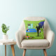 This Retro Urban Cartoon Couple Throw Pillow features the cartoon drawing of an elegantly decorated penthouse apartment, overlooking a city skyline. The apartment features a green floor and a green brick wall. On the wall are four Classic Movie Martini Stretched Canvas Prints, also available from StrangeLittleOnion's Zazzle store (hint, hint!). Three of the prints feature turquoise backgrounds and one is on a black background. Beneath the canvas prints, is a blue, mid century modern sofa. A sophisticated, raven-haired beauty is sitting on the sofa. She is wearing a classic, little, black dress with a hot pink bodice. On the opposite side of the room there is a suave, tall, dark, and handsome man. He is wearing a black suit, white shirt, and green tie. In one hand, he is holding a vinyl record album, and, in the other hand, he is holding a fun album cover. On the floor, there is an orange ottoman holding a green and black record player. Propped against the ottoman is another album cover with a record rolling out of the side. There are also three colorful vinyl albums scattered about the floor. Behind the man, we can see through the sliding glass doors onto a green balcony. A white cat wearing a pink collar is perched on the edge of the balcony. Beyond the cat, there is a breathtaking city skyline complete with skyscrapers and a yellow crescent moon. The opposite side of the pillow features a green brick pattern. If this is how the other half lives, sign me up!