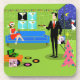 These Retro Urban Christmas Couple Cork Coasters feature the cartoon drawing of an elegant penthouse apartment all decorated for the holidays with strands of colorful Christmas lights and a kitschy, pink, Christmas tree, complete with teal ornaments and a yellow star. The apartment features a green floor and a green brick wall. On the wall are four Classic Movie Martini Stretched Canvas Prints, also available from StrangeLittleOnion's Zazzle store (hint, hint!). Three of the prints feature turquoise backgrounds and one is on a black background. Beneath the canvas prints, is a blue, mid century modern sofa. A sophisticated, raven-haired beauty is sitting on the sofa. She is wearing a vibrant, red dress and Santa hat. In one hand, she is holding a sprig of mistletoe tied with a red bow. On the opposite side of the room there is a suave, tall, dark, and handsome man. He is wearing a black suit, white shirt, and red tie. In one hand, he is holding a vinyl record album, and, in the other hand, he is holding a fun album cover. On the floor, there is an orange ottoman holding a green and black record player. Propped against the ottoman is another album cover with a record rolling out of the side. There are also three colorful vinyl albums scattered about the floor. Behind the man, we can see, through sliding glass doors, snow falling onto a green balcony and the city below. A white cat wearing a red bow around its neck is perched on the edge of the balcony. Beyond the cat, there is a breathtaking city skyline complete with skyscrapers and a yellow crescent moon. If this is how the other half lives, sign me up!