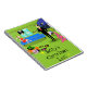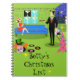 This customizable Retro Urban Christmas Couple Notebook features the cartoon drawing of an elegant penthouse apartment all decorated for the holidays with strands of colorful Christmas lights and a kitschy, pink, Christmas tree, complete with teal ornaments and a yellow star. The apartment features a green floor and a green brick wall. On the wall are four Classic Movie Martini Stretched Canvas Prints, also available from StrangeLittleOnion's Zazzle store (hint, hint!). Three of the prints feature turquoise backgrounds and one is on a black background. Beneath the canvas prints, is a blue, mid century modern sofa. A sophisticated, raven-haired beauty is sitting on the sofa. She is wearing a vibrant, red dress and Santa hat. In one hand, she is holding a sprig of mistletoe tied with a red bow. On the opposite side of the room there is a suave, tall, dark, and handsome man. He is wearing a black suit, white shirt, and red tie. In one hand, he is holding a vinyl record album, and, in the other hand, he is holding a fun album cover. On the floor, there is an orange ottoman holding a green and black record player. Propped against the ottoman is another album cover with a record rolling out of the side. There are also three colorful vinyl albums scattered about the floor. Behind the man, we can see, through sliding glass doors, snow falling onto a green balcony and the city below. A white cat wearing a red bow around its neck is perched on the edge of the balcony. Beyond the cat, there is a breathtaking city skyline complete with skyscrapers and a yellow crescent moon. Simply replace the existing text with your own. If this is how the other half lives, sign me up!