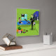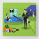 This Retro Urban Cartoon Couple Wall Clock features the cartoon drawing of an elegantly decorated penthouse apartment, overlooking a city skyline. The apartment features a green floor and a green brick wall. On the wall are four Classic Movie Martini Stretched Canvas Prints, also available from StrangeLittleOnion's Zazzle store (hint, hint!). Three of the prints feature turquoise backgrounds and one is on a black background. Beneath the canvas prints, is a blue, mid century modern sofa. A sophisticated, raven-haired beauty is sitting on the sofa. She is wearing a classic, little, black dress with a hot pink bodice. On the opposite side of the room there is a suave, tall, dark, and handsome man. He is wearing a black suit, white shirt, and green tie. In one hand, he is holding a vinyl record album, and, in the other hand, he is holding a fun album cover. On the floor, there is an orange ottoman holding a green and black record player. Propped against the ottoman is another album cover with a record rolling out of the side. There are also three colorful vinyl albums scattered about the floor. Behind the man, we can see through the sliding glass doors onto a green balcony. A white cat wearing a pink collar is perched on the edge of the balcony. Beyond the cat, there is a breathtaking city skyline complete with skyscrapers and a yellow crescent moon. If this is how the other half lives, sign me up!