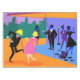 This Retro Urban Rooftop Party Tablecloth is intoxicating in its detail. The cartoon design features the type of wildly sophisticated cocktail party that is normally only seen in movies from the 1960s. There is a lot for the partygoers to take in. From the comfort of a penthouse apartment, guests are enjoying the view and the ambiance. The lighting sets the mood and we are able to see the darkened silhouettes of an attractive couple dancing the cha-cha. On the floor, there is a purple, portable, record player at the feet of the dancing couple. Several albums have been scattered nearby. Even with the dimmed lighting that makes practically everything in the room appear in shades of purple, blue and black, we can tell that everyone is dressed to the nines. Behind the dancing, indoor couple, there is a gentleman in a black suit holding a martini glass. He is talking to a dark haired beauty who is standing near one of the floor to ceiling glass walls. From a lampstand, a single bulb is casting a romantic glow on the scene. The only thing missing is the lampshade. Hmm... Where is the shade? It's on the head of a tipsy man who has taken the party outside to the orange rooftop. He's clearly got some fine dance moves and he isn't afraid to show them to the world! His companion is a shapely, blonde woman in a bright pink dress. Her back is arched as she throws back her martini in an uninhibited fashion. Beyond the party, there is a breathtaking teal skyline, complete with skyscrapers and a purple sky. If this is how the other half lives, sign me up!