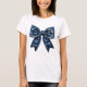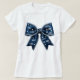 Cute denim-style bow illustration with frayed edges, stitched details, and white heart accents, featuring playful Valentine phrases like “XOXO,” “Be Mine,” “Love,” and “Kiss.” A charming, cozy design perfect for romantic and gift-themed.