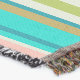 A quality printed throw has its advantages. This is a much finer weave throw than its loopier cousins, and though lighter, it is worth the investment for custom room accessorizing. The back is much prettier than the typical brown, and the fringe on the long sides very vivid, the selvage nicely done. Before photographing, I washed the throw in cold water, delicate, with a thicker woven throw the same size. On tumble dry low, this throw was dry in half the time as the other. This is a very practical quality if you use throws for furniture covers or to wrap up in frequently. The sleekness of the fabric makes it a great layer for accenting or protecting without the feeling of sitting on too much stuff. Perfect for napping or when you feel a light chill coming on. The color printing is beautiful and on this fabric, matched the design and color of my Photoshop image. This is an advantage for blending room fabrics and colors. The fringe on the short sides prints the colors from the design image and therefore varies from the side fringe. I streaked a white fractal line through the plaid pattern to give the illusion of weaving. This printed as crisp as an illusory thread, and put some white in the short side fringe, showing another advantage of print vs loomed- for artistic purposes, line lines, detail, and color integrity can be planned and preserved. My loomed throws have color limitations and more of a needlepoint texture. Print throws reproduce an exact image. The throw felt a little stiff straight out of the package, but this went away in the first delicate wash. Of course I searched the wash water for ink or bleeding and there was none.