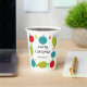 Jingle and mingle in style with paper cups that are ready to be personalized with your own headline and name or other custom text. Your text is surrounded by illustrations of tree ornaments in bright red, turquoise blue and lime green with a fun vintage style. The text and graphics appear on both sides of this cup.
