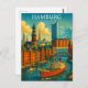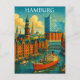 Beautiful retro vintage travel illustration of Hamburg Germany on a postcard showing the famous landmark and iconic building Elbphilharmonie with its iconic architecture. It also shows the famous port of Hamburg and the Speicherstadt. This product makes an amazing souvenir and gift idea for every tourist of the german city.