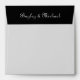 Add an extra touch to the arrival of your retro vinyl invitation or vintage record save the date. This fun custom envelope coordinates with our folded Album Cover Black and White Invitation. The front has a record on the upper left corner. Your names curve around the record. Your return address is on the left side. The back flap is black and features your name in script. The interior of the envelope features a printed vinyl record pattern–an easy alternative to an envelope liner.