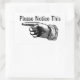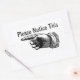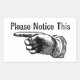 This retro sticker contains the drawing of a hand with pointed finger. It shows to the left and says "please notice this". It can be used to indicate danger or something of importance. The design is classic hand-drawn (woodcut) and comes from an old book. Using this item will convey whatever notice you want your customer or visitor to take, but in a classy and vintage style. Ideal for the antique shop of any area where you don't want to disturb the timeless ambience with a modern sign.