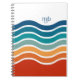 With its colorful sporty look and timeless retro vibe, this bright pattern of wavy stripes in red, orange, turquoise and blue on a white background exudes a happy outlook. A text template is included to personalize with your monogram initials or other desired text. Get this custom notebook for school, home, or office.