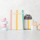 A seamless pattern featuring gentle wavy stripes in a vintage-inspired color palette of red, yellow, teal, and pink on a cream background. The softly flowing lines create a playful, rhythmic design that evokes a sense of nostalgia. This pattern’s warm, retro colors add a whimsical and cheerful vibe.