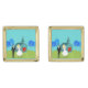 This Retro Wedding Couple Cufflinks will have you hearing wedding bells. The 1960's style, minimalist art design features a bride and groom on their wedding day. The happy couple looks good enough to be standing atop a wedding cake. But they aren't. They're standing on lush, green grass. The debonaire Mr. is wearing a classic, black tuxedo with black bow tie. Down, ladies! He's taken! He is holding the hand of his beautiful Mrs., who looks positively radiant in her tea length, white gown with form fitting waist and flared skirt. She truly looks like a princess with her tiara and gauzy, white wedding veil resting on her pretty blonde head. Beside them, a path in the grass leads to the world's most charming chapel. The quaint, teal and turquoise church is the perfect setting for saying, "I do!" Yes, here is the church. Here is the steeple. We can only assume that, behind those bright red, double doors is a roomful of people just waiting to share in this couple's happiness. The picturesque setting also includes four, stylistic, cartoon trees in shades of blue. It's a beautiful day for a wedding, as we can see from the flawless aqua sky. The only thing missing from this mid century modern design is the rice, and we can assume that will be forthcoming.