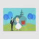 This Retro Wedding Couple Tissue Paper will have you hearing wedding bells. The 1960's style, minimalist art design features a bride and groom on their wedding day. The happy couple looks good enough to be standing atop a wedding cake. But they aren't. They're standing on lush, green grass. The debonaire Mr. is wearing a classic, black tuxedo with black bow tie. Down, ladies! He's taken! He is holding the hand of his beautiful Mrs., who looks positively radiant in her tea length, white gown with form fitting waist and flared skirt. She truly looks like a princess with her tiara and gauzy, white wedding veil resting on her pretty blonde head. Beside them, a path in the grass leads to the world's most charming chapel. The quaint, teal and turquoise church is the perfect setting for saying, "I do!" Yes, here is the church. Here is the steeple. We can only assume that, behind those bright red, double doors is a roomful of people just waiting to share in this couple's happiness. The picturesque setting also includes four, stylistic, cartoon trees in shades of blue. It's a beautiful day for a wedding, as we can see from the flawless aqua sky. The only thing missing from this mid century modern design is the rice, and we can assume that will be forthcoming.
