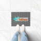 Orange welcome with retro aqua stars on a grey star pattern background.