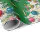 This wrapping paper features a whimsical and retro Christmas theme. This design showcases a repeating pattern of fluffy white Christmas trees decorated with colorful vintage ornaments and beaded garlands. This design is set against a vibrant green background. This charming paper is perfect for anyone who loves the nostalgic feel of a mid-century holiday.