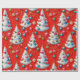This wrapping paper features a whimsical and retro Christmas theme. This design showcases a repeating pattern of fluffy white Christmas trees decorated with colorful vintage ornaments and beaded garlands. This design is set against a vibrant red background. This charming paper is perfect for anyone who loves the nostalgic feel of a mid-century holiday.