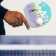 This Retro Winter Ski Resort Ping Pong Paddle has something for everyone. The picturesque cartoon drawing features a snow-covered mountain range with green cedar trees. A lone skier, wearing red, orange, and royal blue, can be seen swooshing down the tallest mountain. Snow is continuing to fall from clouds in the turquoise sky. We can see the silhouettes of happy people whizzing by in ski lift gondolas. Perched above the trees, there is a mid century modern, elevated ski chalet. Through the glass walls, we can see a dark haired beauty resting in bright purple egg chair. She is wearing a green sweater, navy blue pants and a cumbersome white cast on one leg. Don't feel too sorry for her. She's enjoying the warmth of an olive green, cone shaped fireplace with a roaring fire. She also has an awesome view of a couple of romantic ice skaters on a frozen, purple ice rink. The man of the duo is wearing a black jumpsuit with a yellow turtleneck. His hands are wrapped around his partner's waist. She's a gorgeous redhead whose hair is in a ponytail. She is wearing an ice blue top and short, flouncy, sea foam green skirt. They are having the time of their lives, but let's hope they notice the crack in the ice.