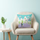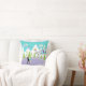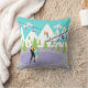 This Retro Winter Ski Resort Throw Pillow has something for everyone. The picturesque cartoon drawing features a snow-covered mountain range with green cedar trees. A lone skier, wearing red, orange, and royal blue, can be seen swooshing down the tallest mountain. Snow is continuing to fall from clouds in the turquoise sky. We can see the silhouettes of happy people whizzing by in ski lift gondolas. Perched above the trees, there is a mid century modern, elevated ski chalet. Through the glass walls, we can see a dark haired beauty resting in bright purple egg chair. She is wearing a green sweater, navy blue pants and a cumbersome white cast on one leg. Don't feel too sorry for her. She's enjoying the warmth of an olive green, cone shaped fireplace with a roaring fire. She also has an awesome view of a couple of romantic ice skaters on a frozen, purple ice rink. The man of the duo is wearing a black jumpsuit with a yellow turtleneck. His hands are wrapped around his partner's waist. She's a gorgeous redhead whose hair is in a ponytail. She is wearing an ice blue top and short, flouncy, sea foam green skirt. They are having the time of their lives, but let's hope they notice the crack in the ice. The opposite side of the pillow features a solid, turquoise background.