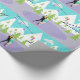 This Retro Winter Ski Resort Wrapping Paper has something for everyone. The picturesque cartoon drawing features a snow-covered mountain range with green cedar trees. A lone skier, wearing red, orange, and royal blue, can be seen swooshing down the tallest mountain. Snow is continuing to fall from clouds in the turquoise sky. We can see the silhouettes of happy people whizzing by in ski lift gondolas. Perched above the trees, there is a mid century modern, elevated ski chalet. Through the glass walls, we can see a dark haired beauty resting in bright purple egg chair. She is wearing a green sweater, navy blue pants and a cumbersome white cast on one leg. Don't feel too sorry for her. She's enjoying the warmth of an olive green, cone shaped fireplace with a roaring fire. She also has an awesome view of a couple of romantic ice skaters on a frozen, purple ice rink. The man of the duo is wearing a black jumpsuit with a yellow turtleneck. His hands are wrapped around his partner's waist. She's a gorgeous redhead whose hair is in a ponytail. She is wearing an ice blue top and short, flouncy, sea foam green skirt. They are having the time of their lives, but let's hope they notice the crack in the ice.