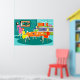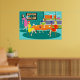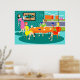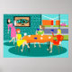 This Retro Women's Weekly Card Game Poster features a cartoon drawing of four mid century modern women at a hen party. They are socializing in a stylish dining room. On a turquoise and teal brick wall, there is a Mid Century Modern Globe Art Stretched Canvas Print, which is available from StrangeLittleOnion's Zazzle store. My, they have good taste! Through sliding glass doors, we can see the lush, green lawns of suburbia. Across the street, there is a sleek orange house with a pink and white car parked in the carport. Back in the dining room, three women are seated at a round table with an orange tablecloth. There is a redhead in a yellow dress, a brunette in a green dress, and a blonde in a red dress. They are holding cards in their hands. Four teacups are on the table just waiting to be filled by the raven haired hostess in a pink wiggle dress. She is carrying a tray with a tea carafe perched on top of it. All of the women are having a wonderful time, but they should probably keep an eye on the blonde. If that card she's holding behind her back is any indication, she cheats!